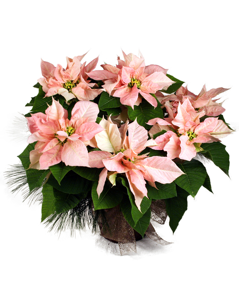 Our locally-grown poinsettia plants nestled into a lovely holiday basket or upgraded container and accented with a bow. Containers may vary. They are locally grown at our greenhouses in Fort Wayne, Indiana.
