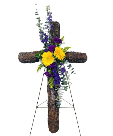 A delicate angel vine cross is placed on an easel and thoughtfully decorated with bright flowers in yellows, purples, and blues. The smaller version is shown without flowers so that you can see materials and scale. Large - 34" tall Small - 22" tall