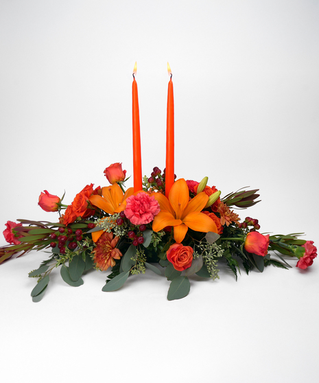 Two orange taper candles complete the arrangement making it perfect for your Thanksgiving celebrations.
