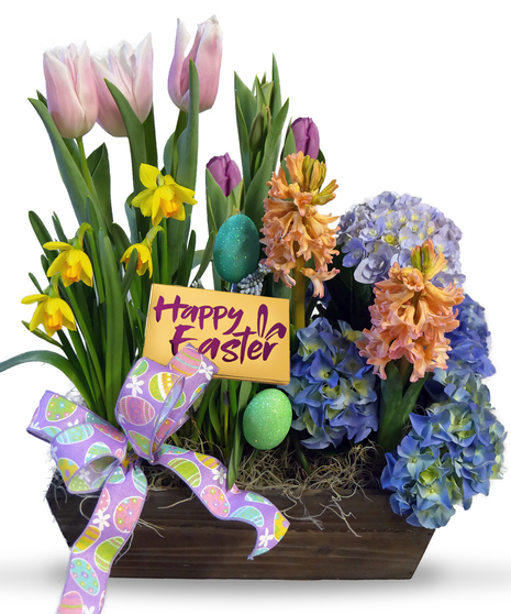 Did some bunny say spring blooms? This keepsake wooden box is delightfully filled with seasonal blooming plants like tulips, daffodils, hydrangeas, and hyacinth.