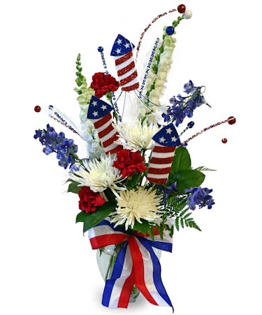 Let's have a blast! Sparkly rockets blast off above a patriotic mix of red carnations, blue delphinium, and white fujis and snapdragons! It's the most patriotic way to celebrate the holiday!
