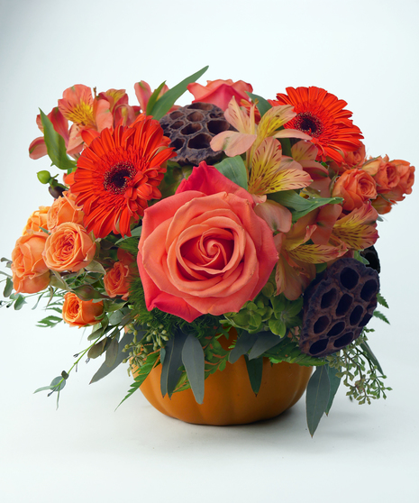 Turn up the autumn energy with Orange Crush! This vibrant design bursts with warm, glowing hues of orange and amber, featuring roses, gerbera daisies, alstroemeria, and lush fall textures arranged in a charming pumpkin-shaped container. Perfect for brightening any space, celebrating the season, or sending cheerful fall wishes.