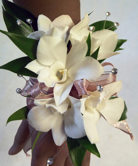 Five dendrobium orchid blooms with green foliage create a beautiful corsage with a basic wristlet and ribbon.