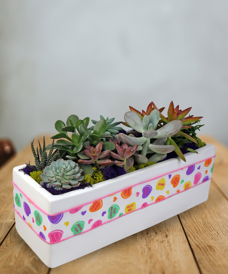 This charming planter features a variety of colorful succulents nestled in a sleek white ceramic container, accented with decorative moss. The planter is wrapped with festive ribbon adorned with conversation heart designs, making it a fun and playful addition to any home or office. A low-maintenance yet thoughtful gift, this succulent arrangement is ideal for plant lovers and those who appreciate a modern twist on Valentine’s Day tradition.