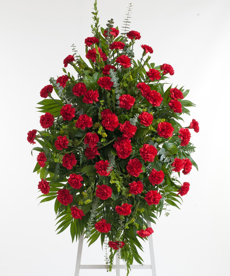 Honor the memory of a loved one with this large spray of carnations mixed with lush greenery makes a thoughtful addition to any service. Available in various colors, this arrangement conveys a heartfelt expression of respect and admiration
